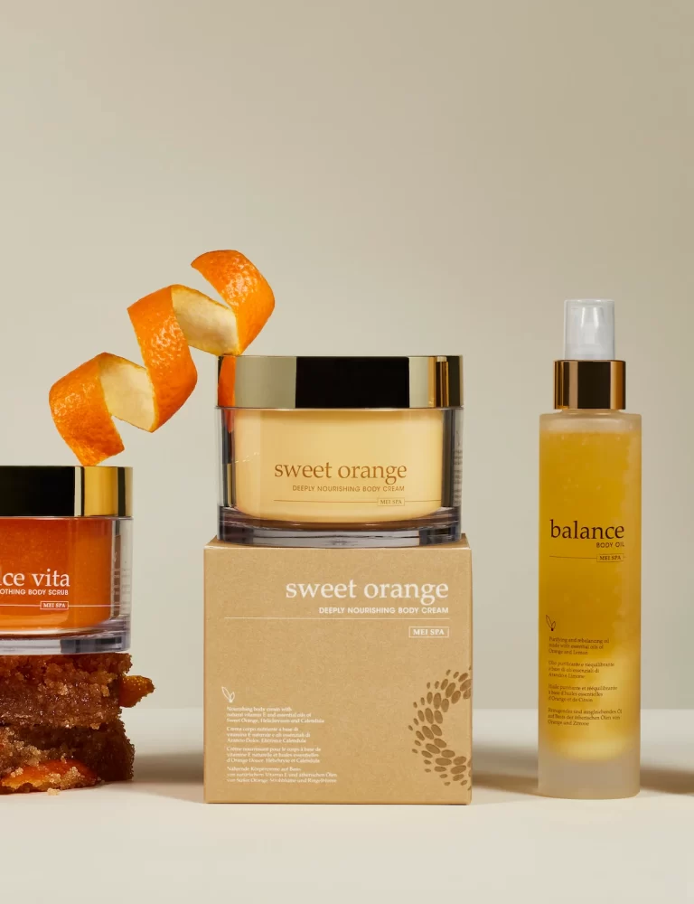 Avvolti dagli oli essenziali di arancio dolce e limone regalerete nuova vita, morbidezza e luminosità alla pelle, grazie alla sinergia dei raffinati prodotti MEI SPA.